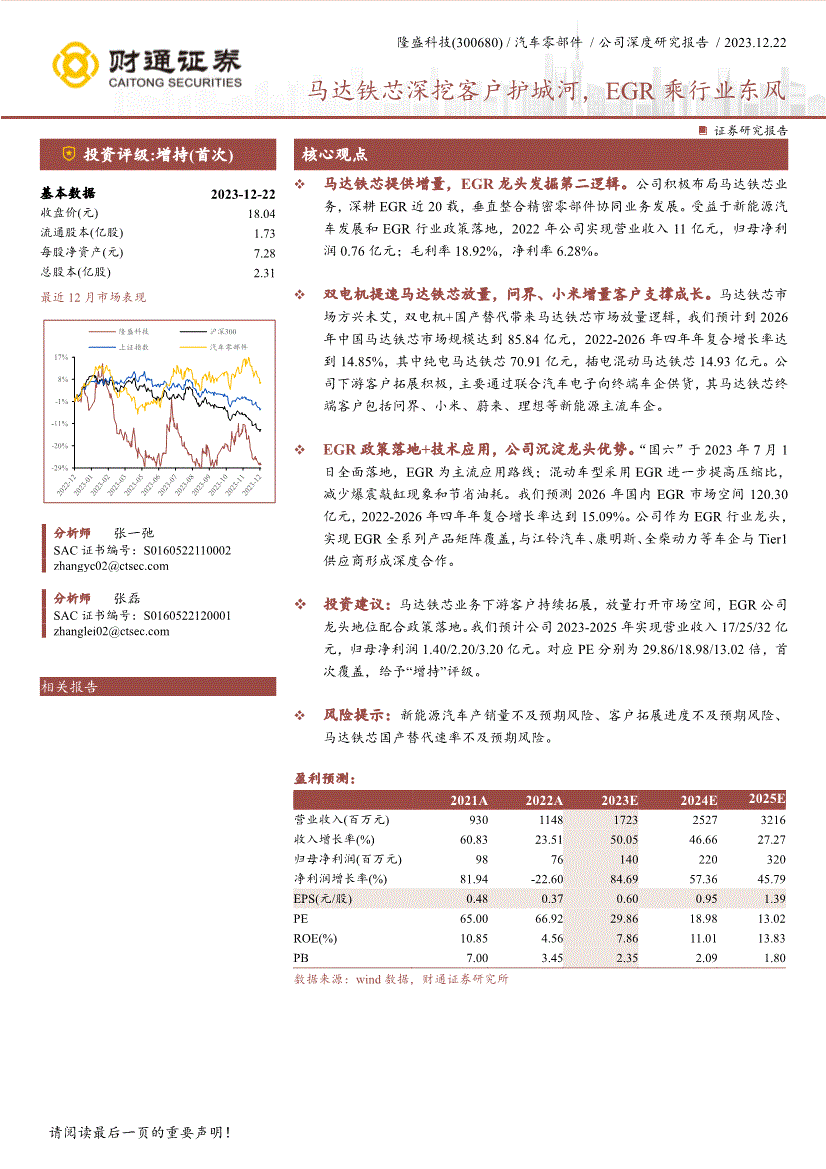 隆盛科技(300680) /汽车零部件/公司深度研究报告/ 2023.12.22 ! 马达铁芯深挖客户护城河,EGR乘行业东风 证券研究报告投资评级:增持(首次) 核心观点基本数据2023-12-22 收盘价(元) 18.04 流通股本(亿股) 1.73 每股净资产(元) 7.28 总股本(亿股) 2.31 最近12月市场表现分析师张一弛SAC证书编号:S02 分析师张磊SAC证书编号:S01 相关报告马达铁芯提供增量,EGR龙头发掘第二逻辑。
